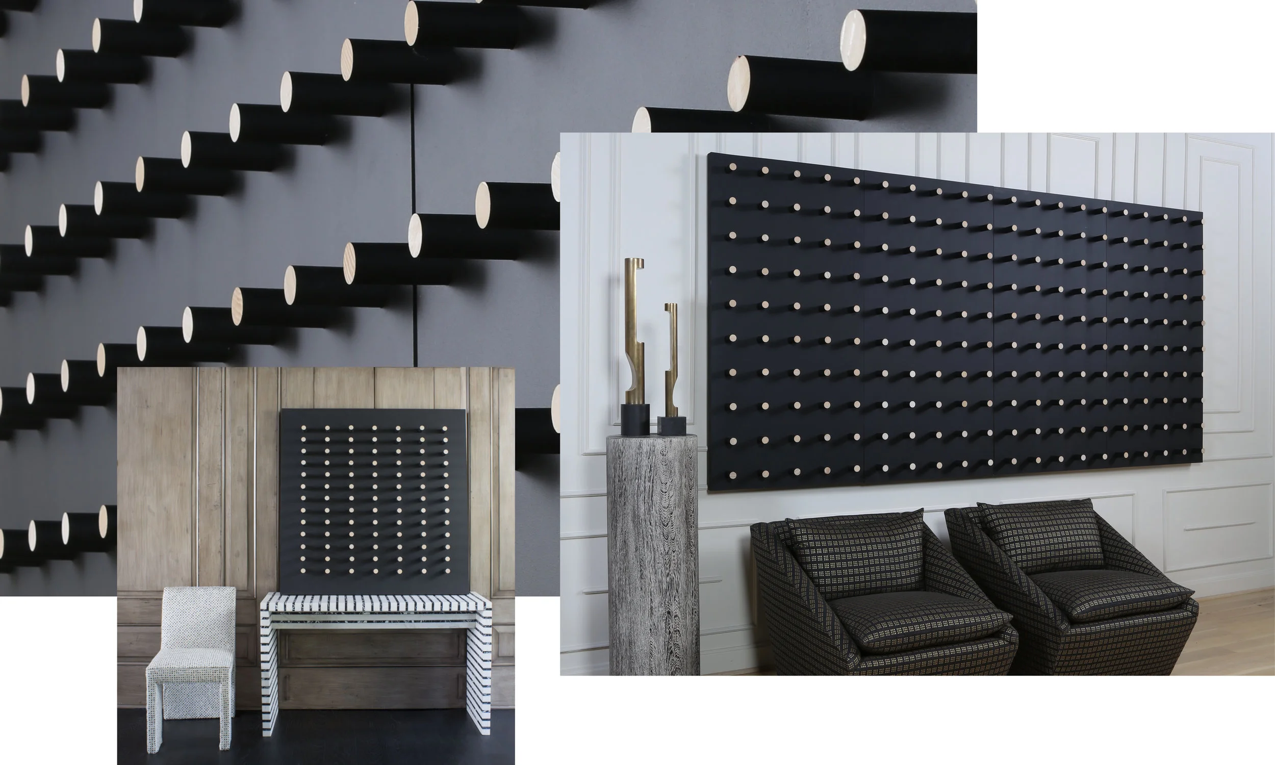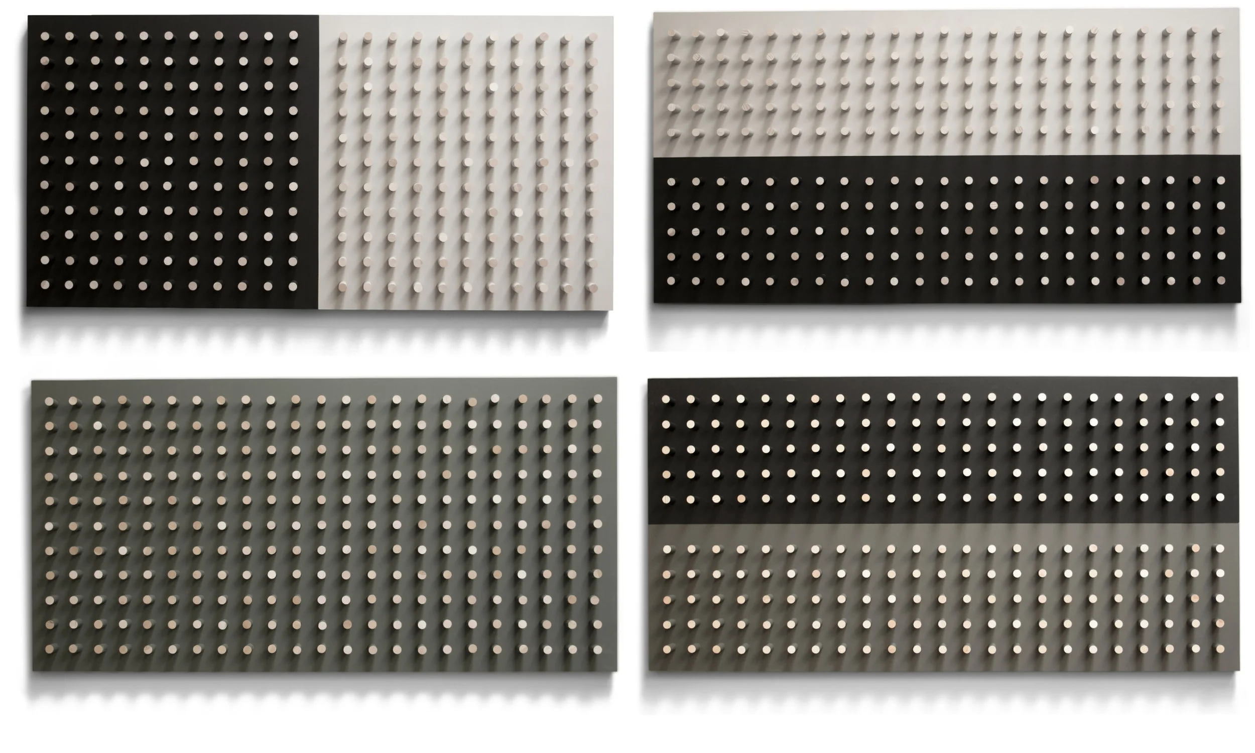 Peg Work, Totemic Sequence is a series of 19 individual Peg Works that span the elevator banks at Hollywood Proper. Each piece is part of a larger totem that undulates color and form from the ground to the sky.
