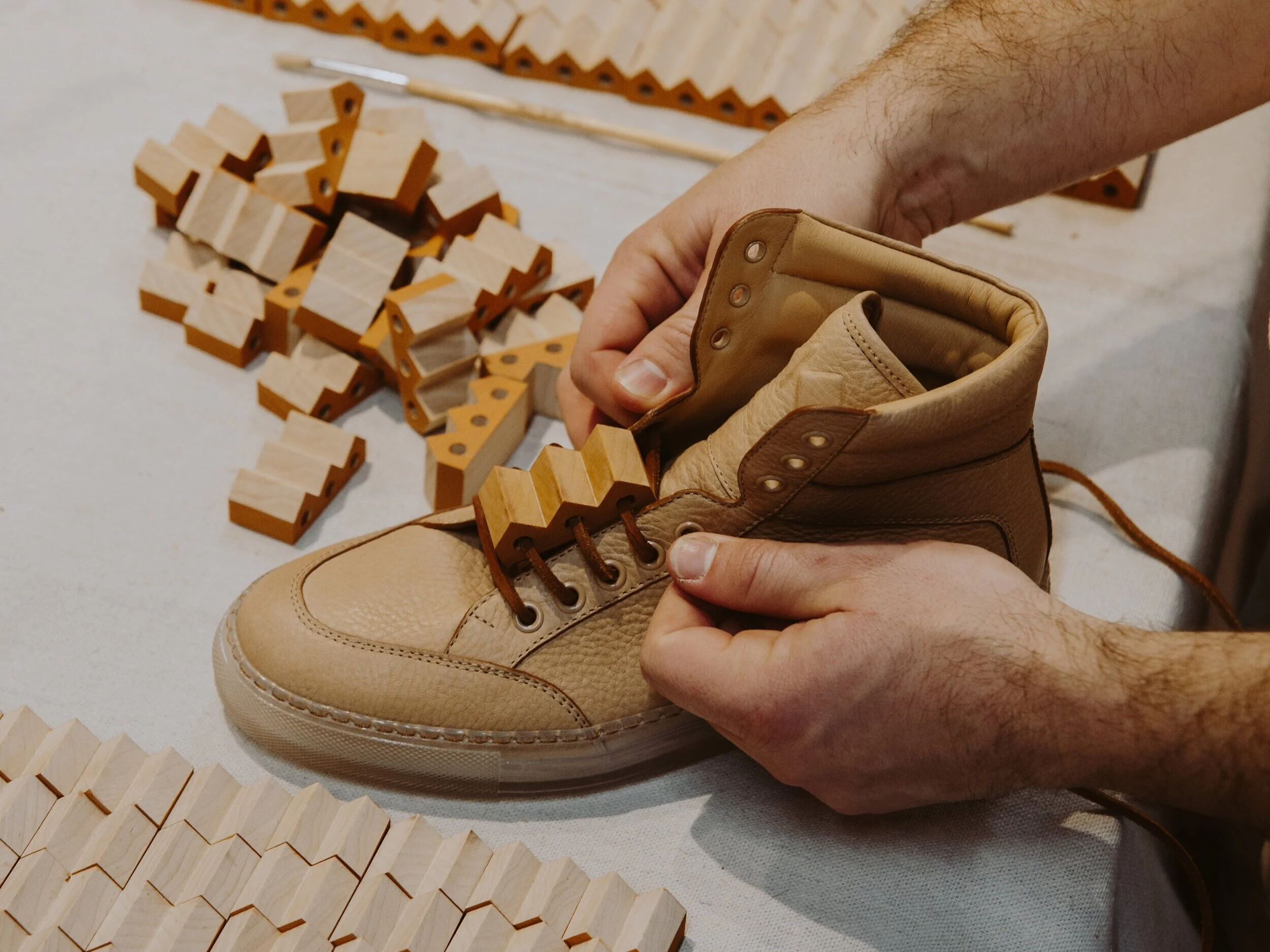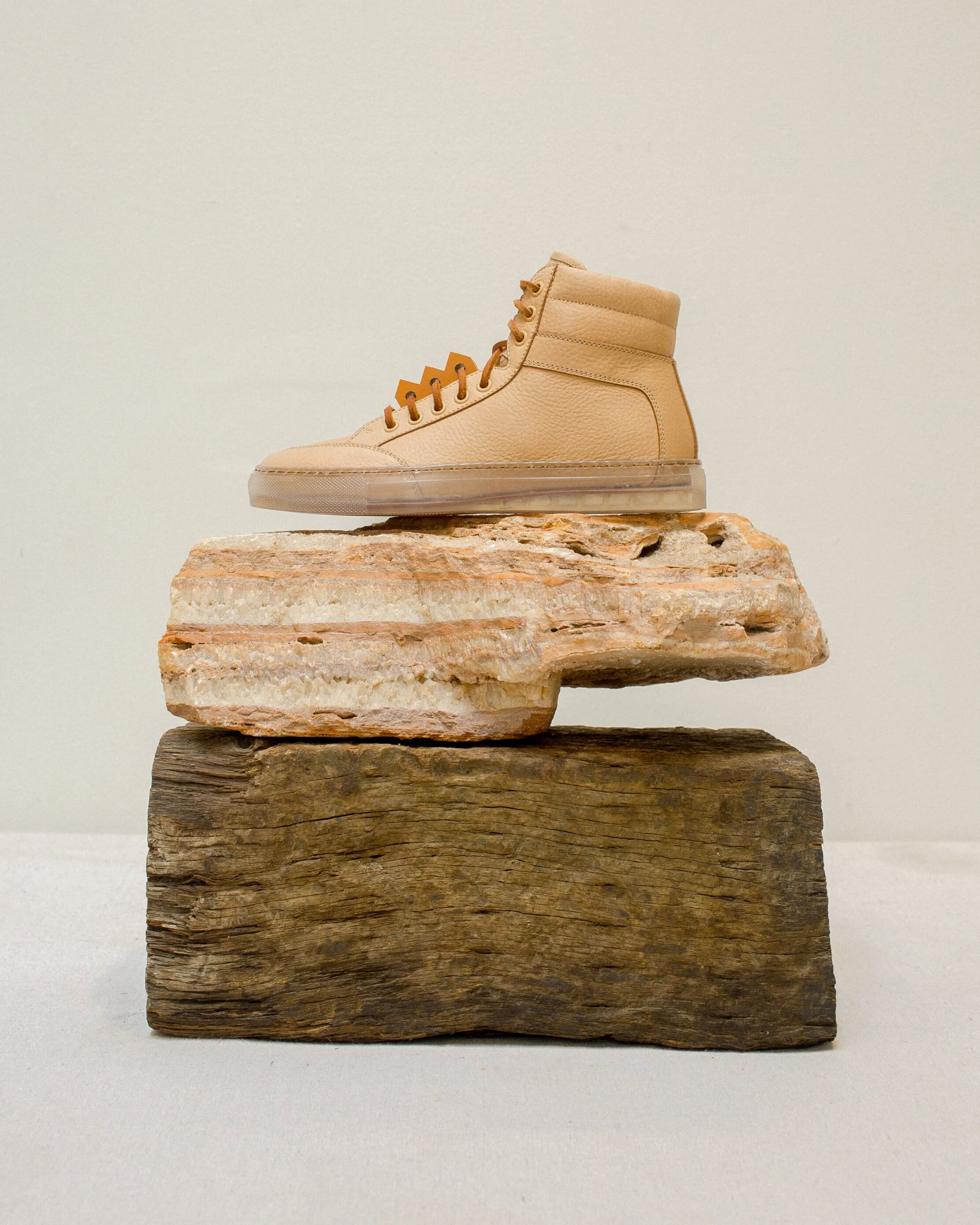 BD: Like my wooden WAVEFORM sculptures, the KOIO x Bradley Duncan sneaker is raw and pared-down. The leather is natural, the sole is clear. Elements are reduced to simplicity. By adding the carved triangle Waveform through the lacing of the shoe we were able to integrate sculpture into every pair.