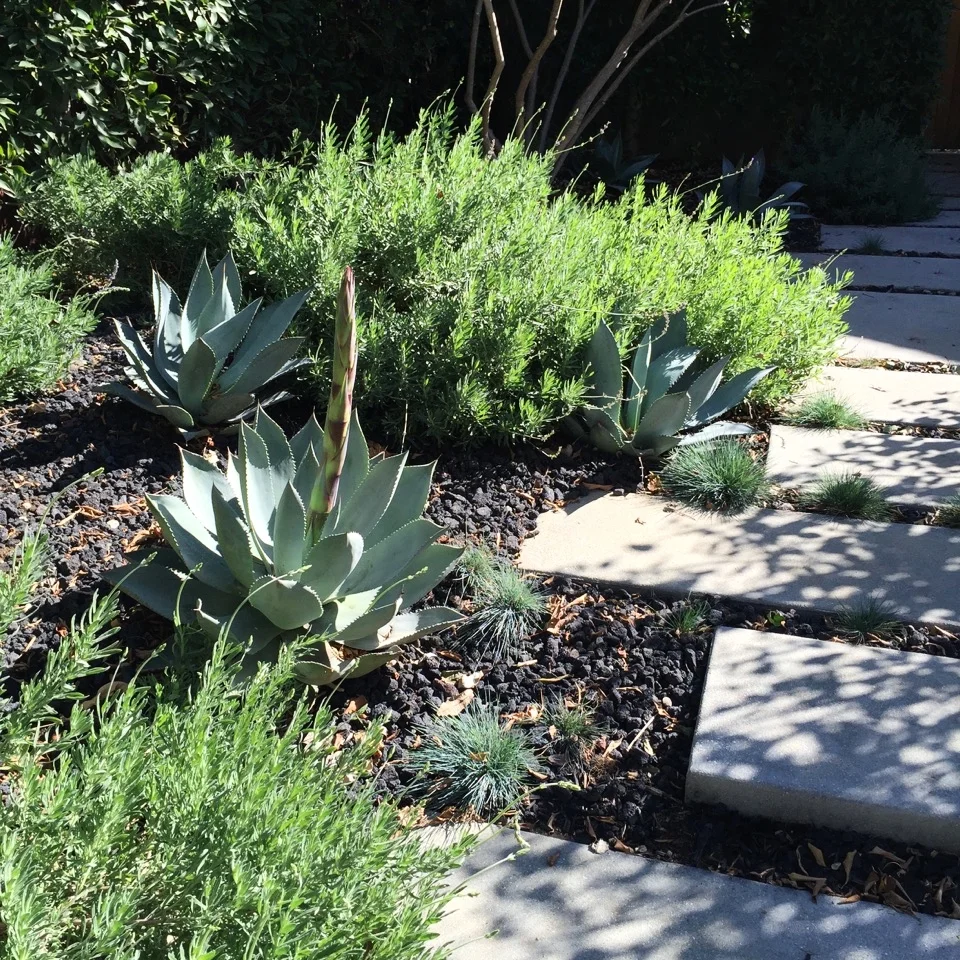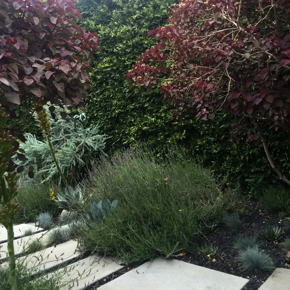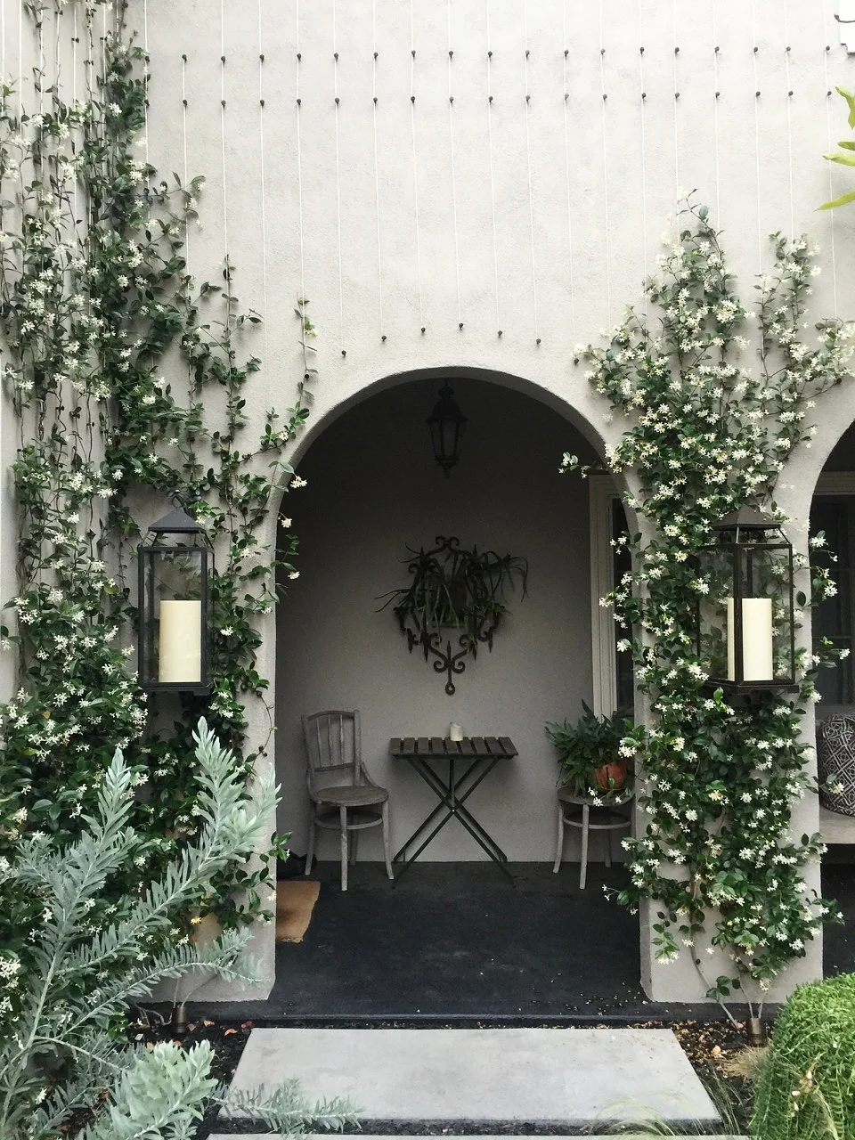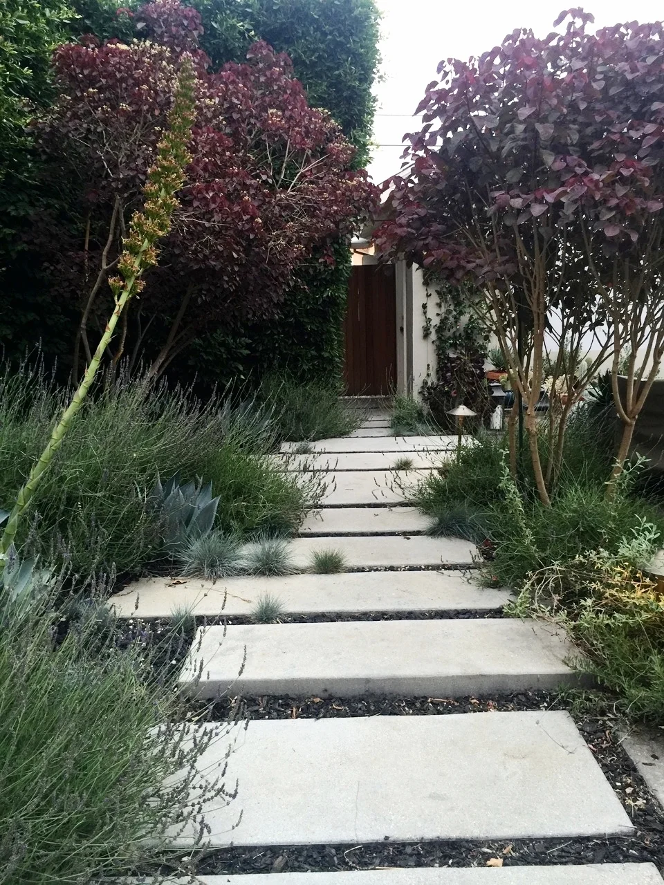 WIRE AND IRON NAILS WERE USED IN PRODUCING A LINEAR FACING THAT COMPLIMENTS THE HOMES ARCHITECTURE. jASMINE CRAWS UP THE WIRE SOFTENING AND ADDING SEASONAL SCENT. cALIFORNIA NATIVE AND DROUGHT TOLERANT SPECIMENS ARE PLANTED ON EACH SIDE OF THE POURED CONCRETE PAVER PATHWAY .