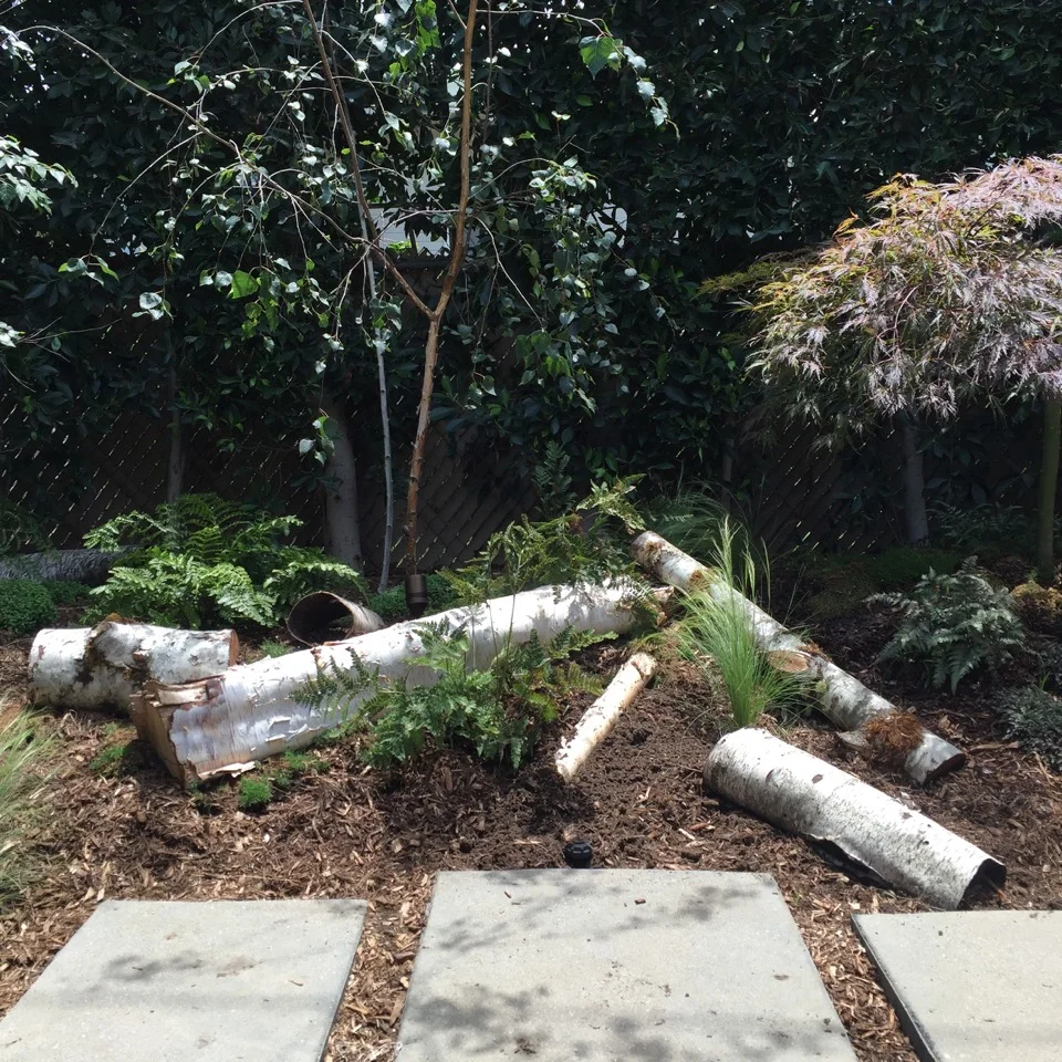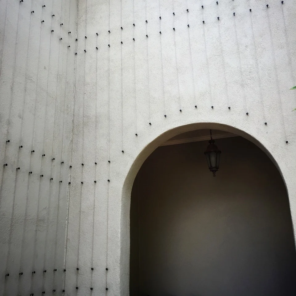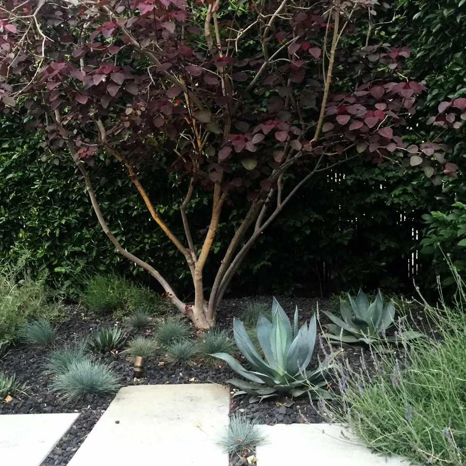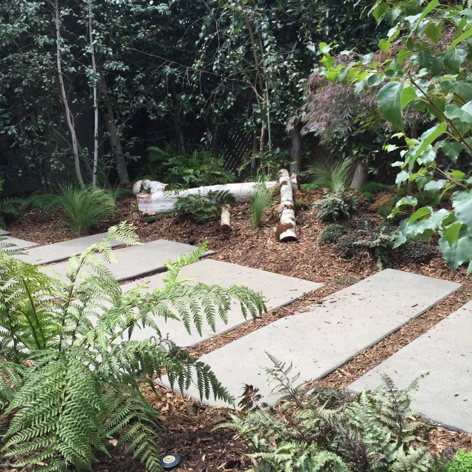 WIRE AND IRON NAILS WERE USED IN PRODUCING A LINEAR FACING THAT COMPLIMENTS THE HOMES ARCHITECTURE. jASMINE CRAWS UP THE WIRE SOFTENING AND ADDING SEASONAL SCENT. cALIFORNIA NATIVE AND DROUGHT TOLERANT SPECIMENS ARE PLANTED ON EACH SIDE OF THE POURED CONCRETE PAVER PATHWAY .